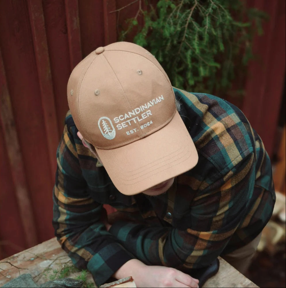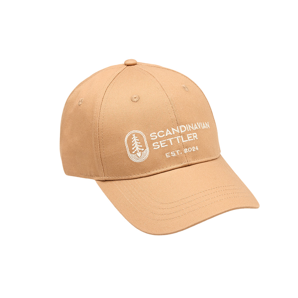 En ljusbrun/beige keps i bomull med Scandinavian Settlers-text och logomärke i vitt.