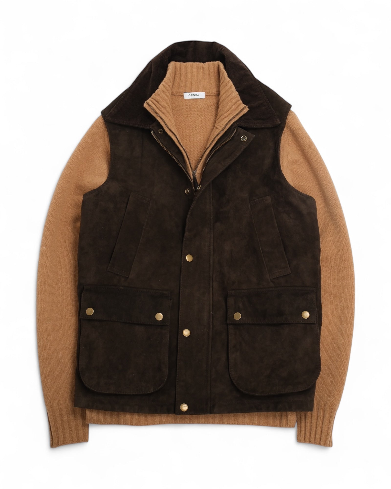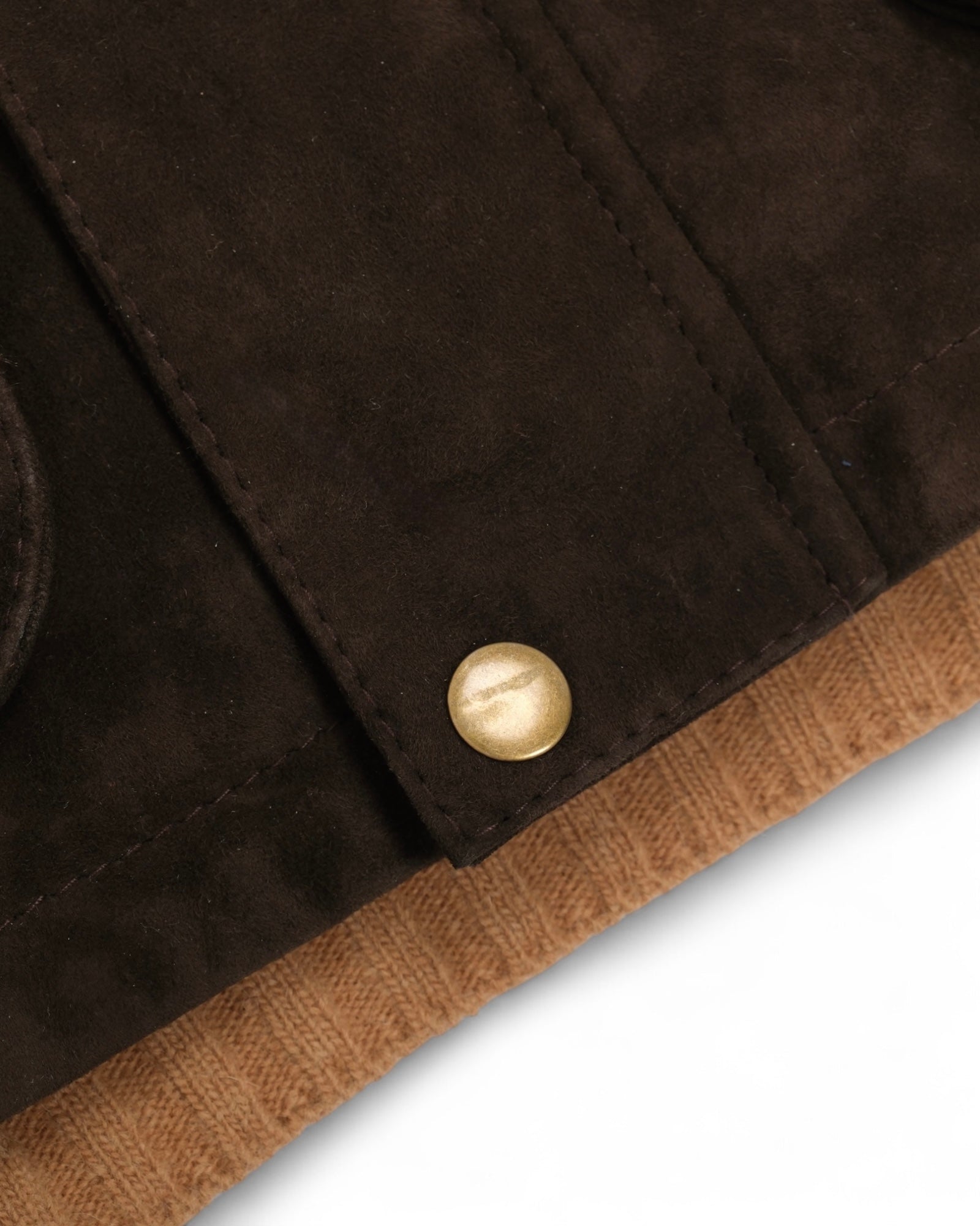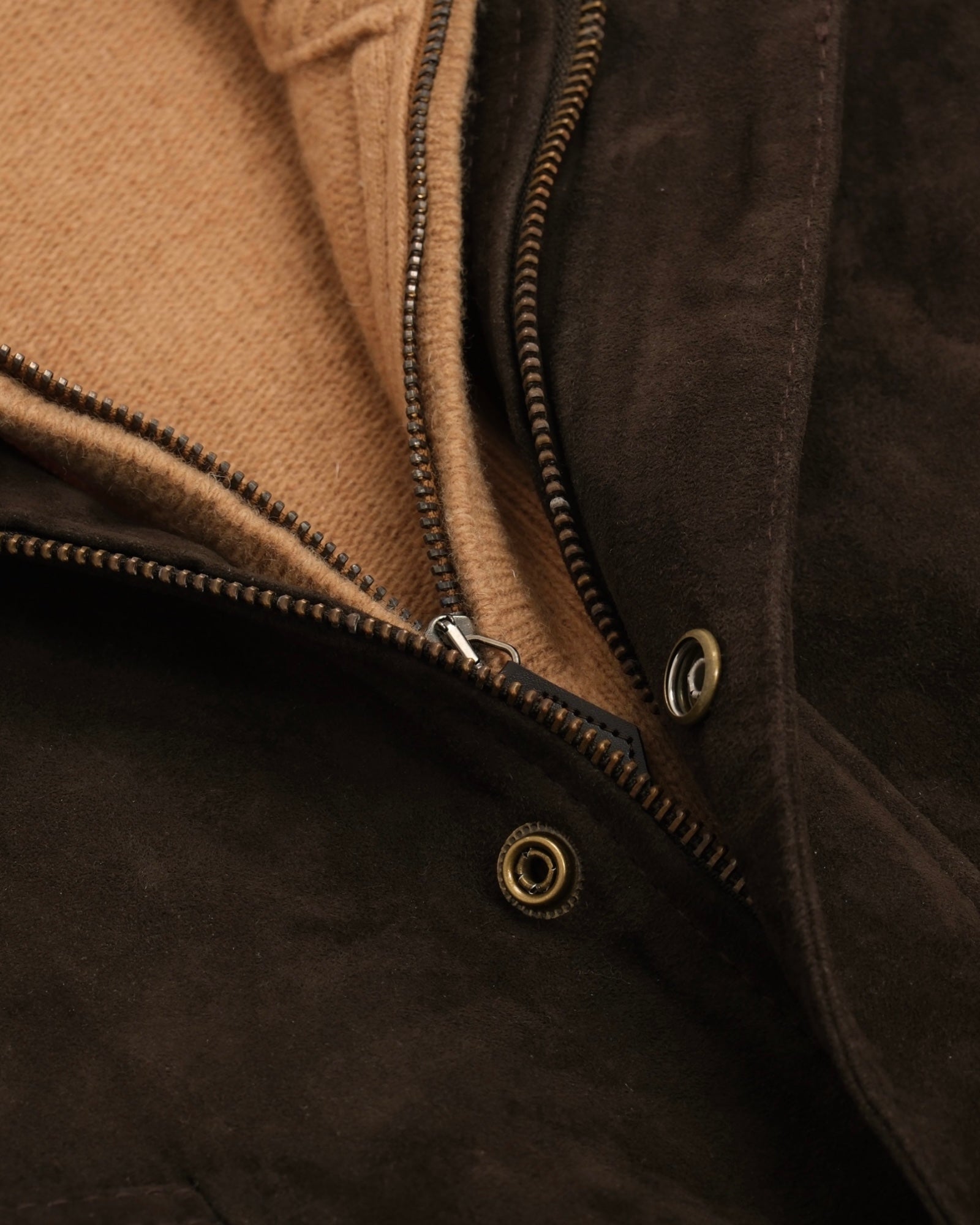 Den robusta tvåvägsdragkedjan pryds av en snygg zip i läder och kompletteras av mässingsfärgade tryckknappar som gifter sig väl med den mörka mockan. Kragen är klädd i brun manchester för en subtil texturkontrast.