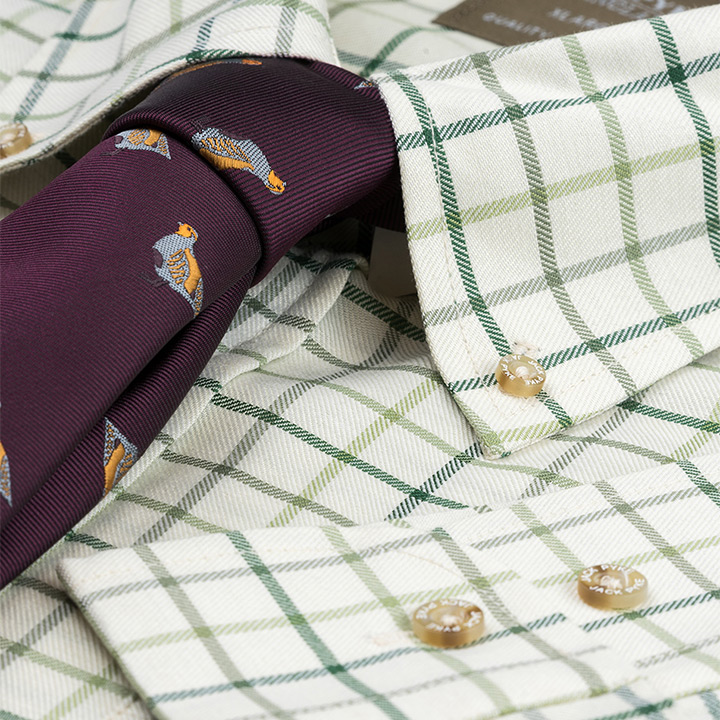 Den här jaktskjortan har gröna rutor mot sin vita bakgrund och gör att den enkelt bärs ihop med alla dina andra plagg i garderoben. Kragen är s.k. button-down krage vilket gör att den håller sig på plats och bärs extra fint ihop med t.ex. slipsen på bilden.