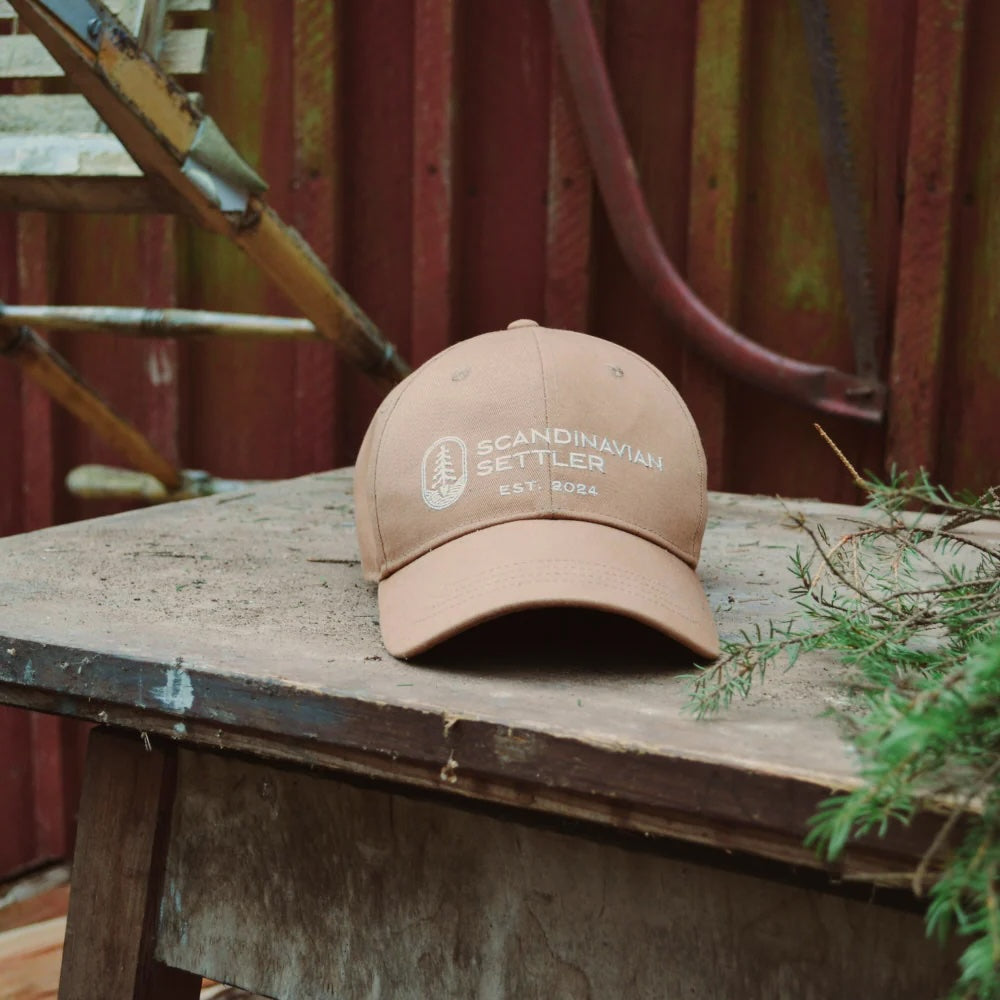 En ljusbrun/beige keps i bomull med Scandinavian Settlers-text och logomärke i vitt.