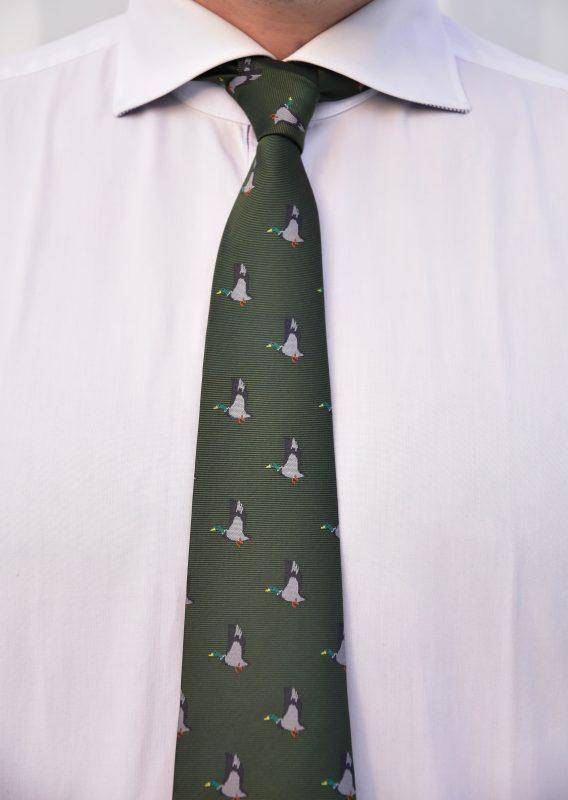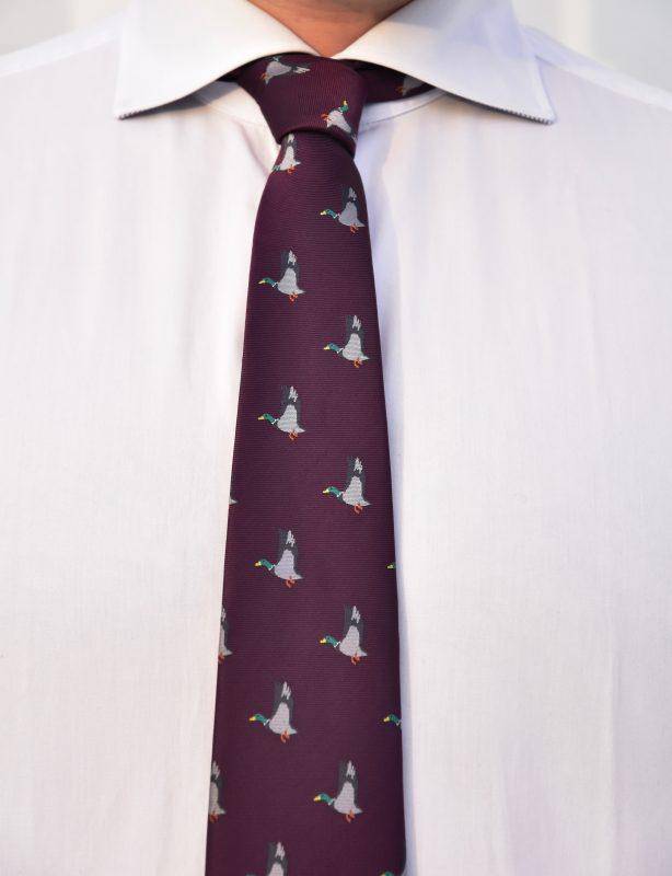 Klassisk slips för jakt i vinröd med andmotiv, även tillgänglig i grön.