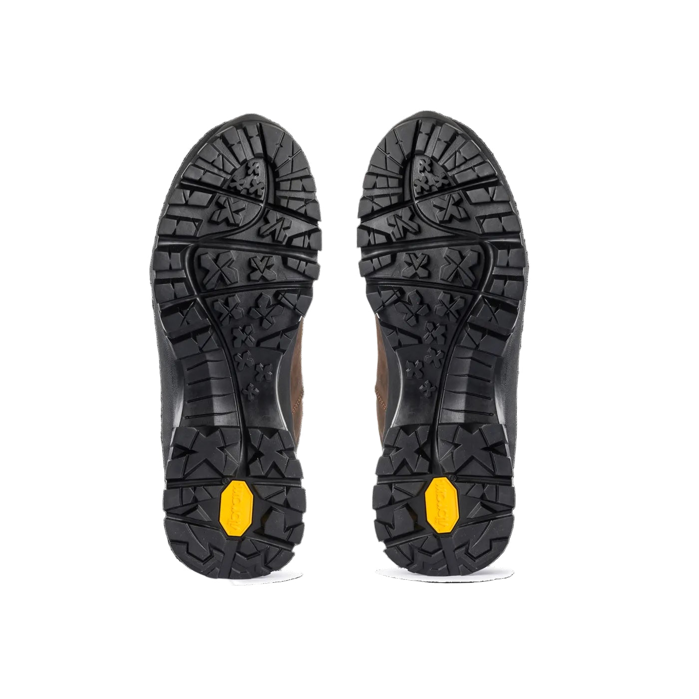 Den robusta Vibram® Bristol-yttersulan är utrustad med stödband, centralt placerad dämpning samt ett mönster som ger säkert grepp även på steniga ytor. Självrensande kanaler och förstärkningar på tå och häl förbättrar fästet i varierad terräng.