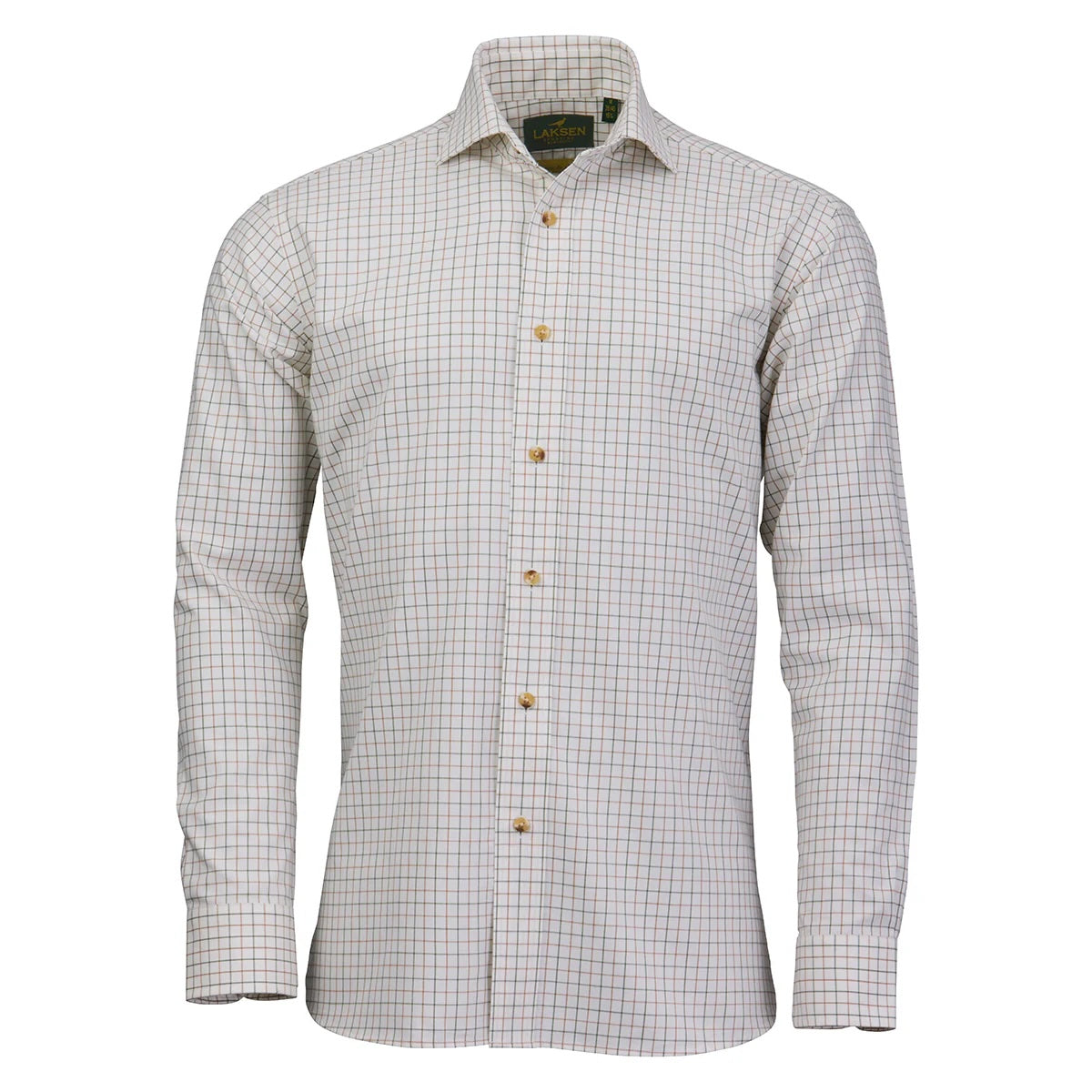 Den har ett klassiskt tattersall-rutmönster i färgerna olive och rum, en bröstficka på vänster sida samt justerbara manschetter som även kan användas med manschettknappar.