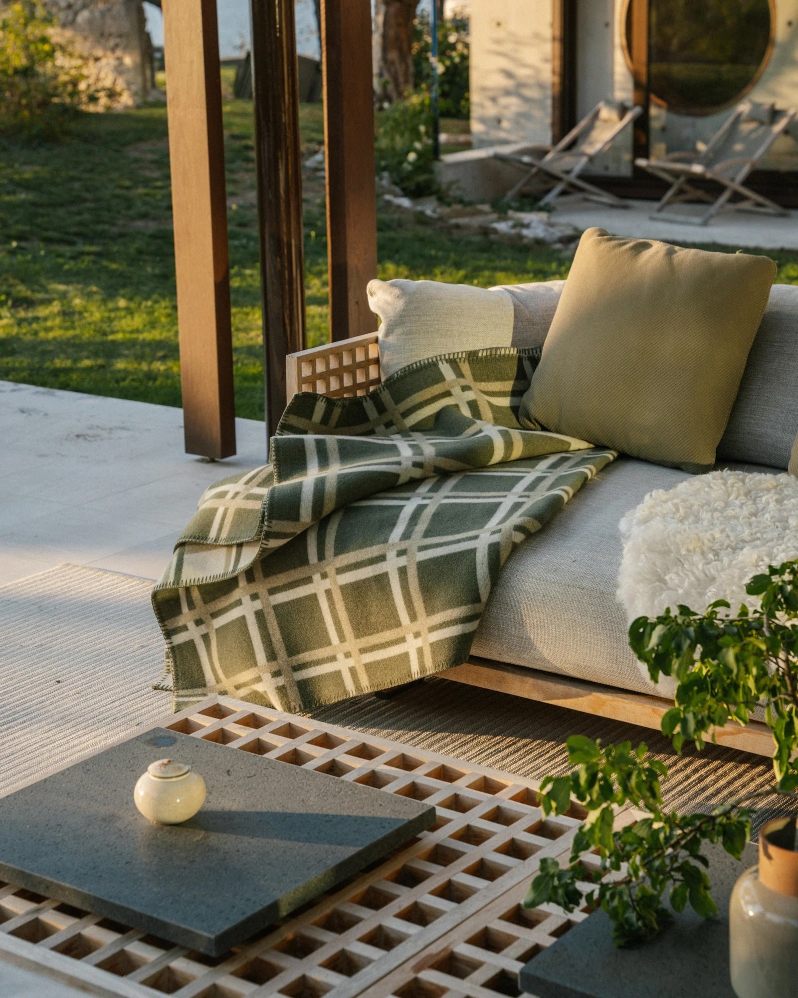 Den mjuka ullen och det diskreta rutmönstret i ton-i-ton-grönt gör filten till ett stilrent inslag i hemmet - lika vacker i soffan som vid sängens fotända.