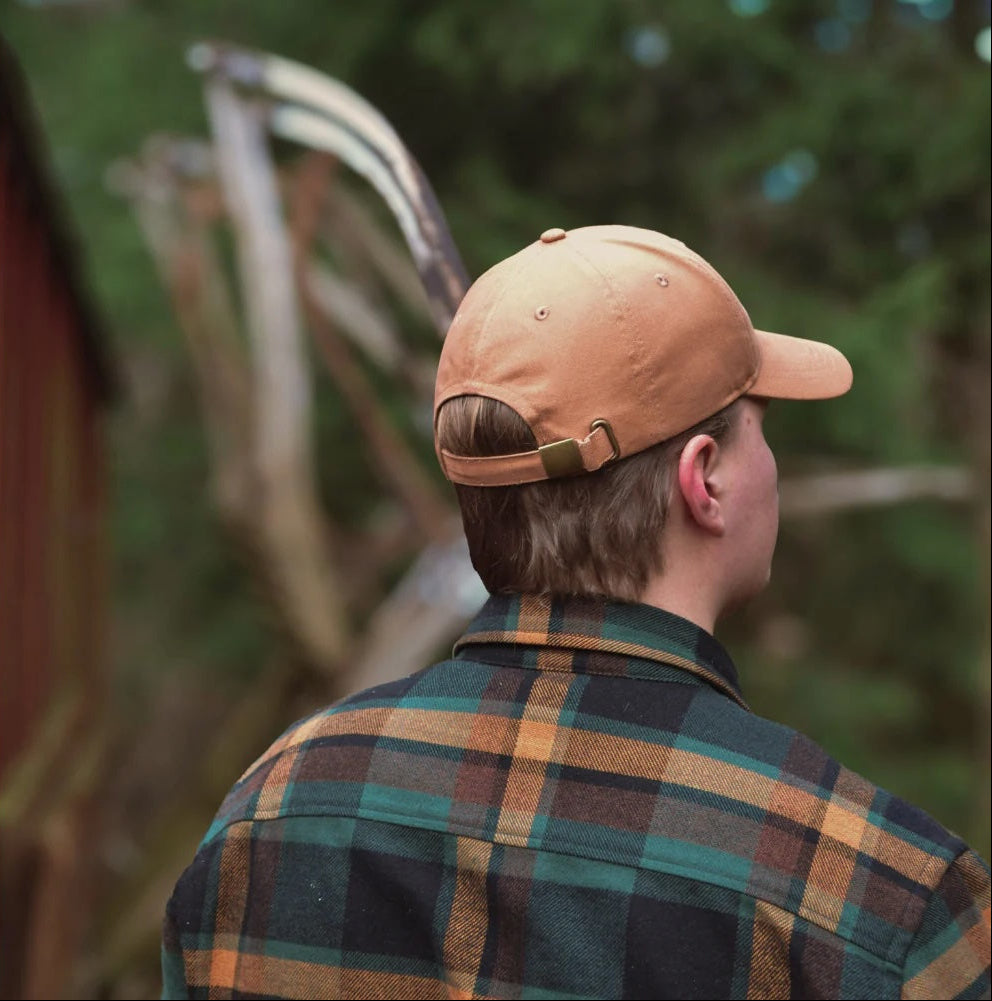 En ljusbrun/beige keps i bomull med Scandinavian Settlers-text och logomärke i vitt.