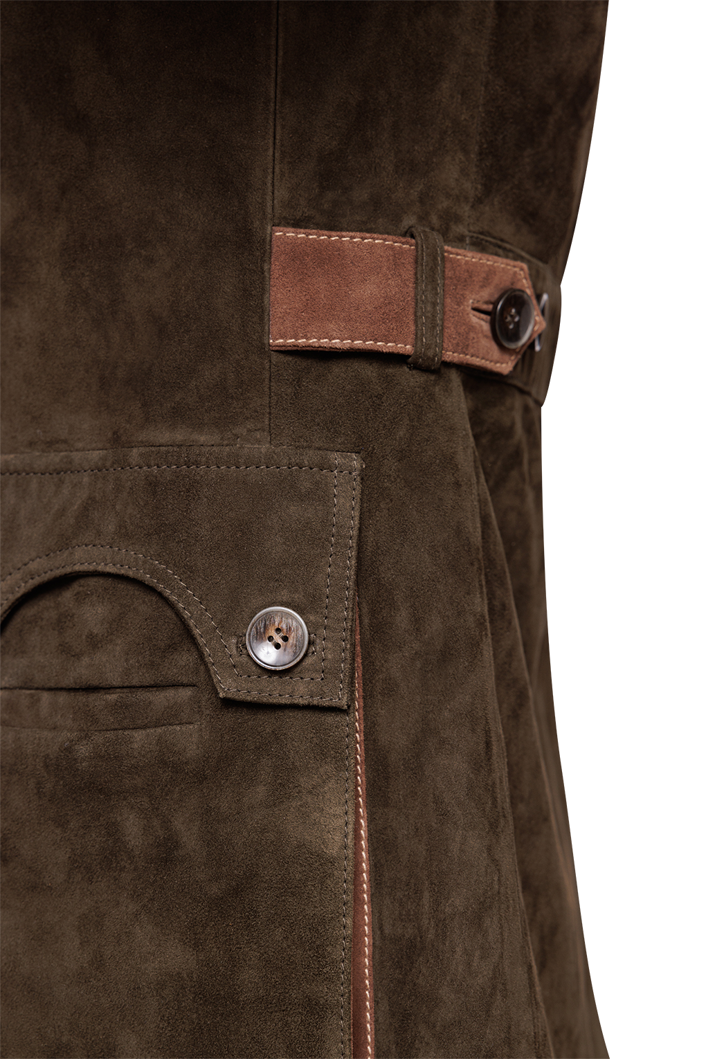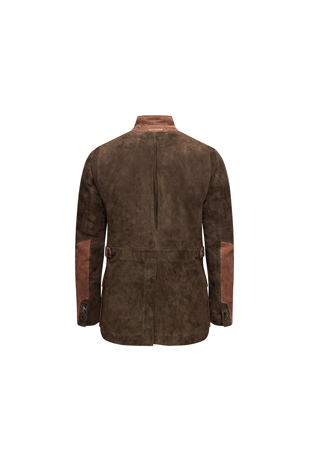 Istället för traditionellt tweedtyg är den tillverkad i mjuk premium getmocka med en lätt vaxad yta som ger kavajen lite extra skydd vid nederbörd. Med tiden utvecklar mockan en vacker patina som gör plagget ännu mer personligt.