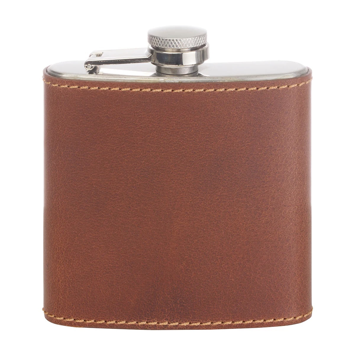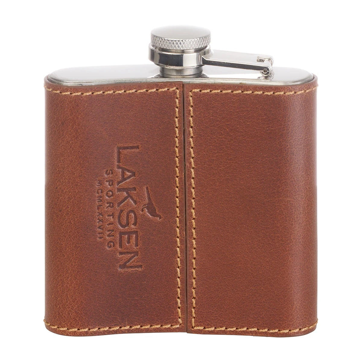 En följsam fickplunta från Laksen klädd i sadelläder och tillverkad i rostfritt stål.